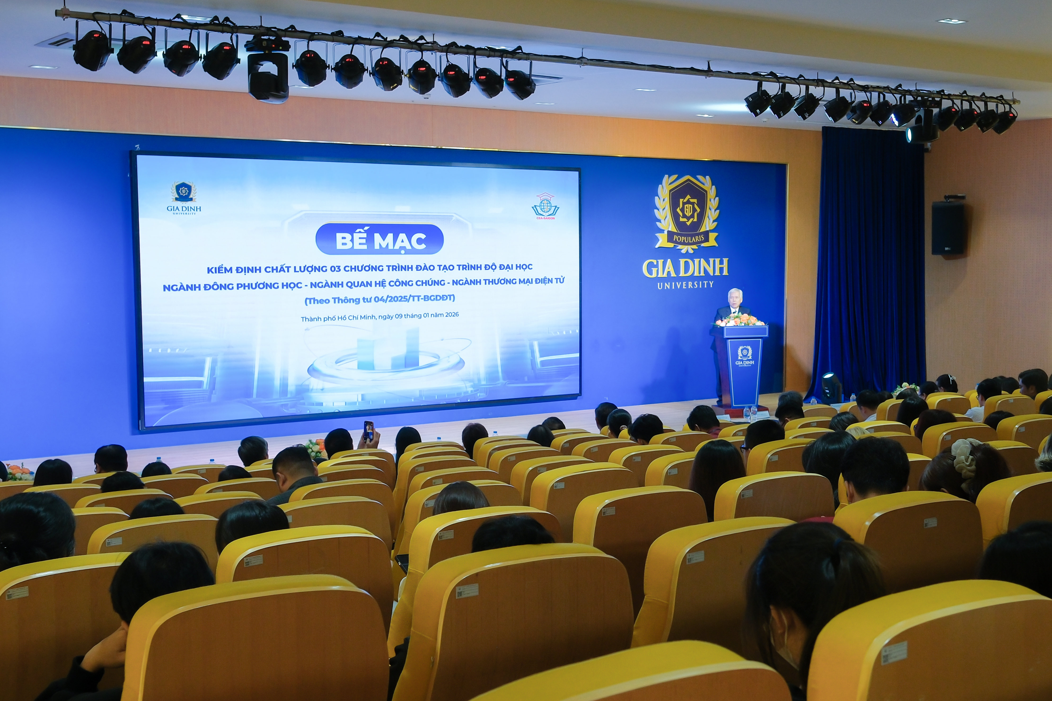 Lượt xem: 17Ngày 09/01/2026, Trường Đại học Gia Định (GDU) đã tổ chức Lễ bế mạc khảo sát chính thức đánh giá ngoài đối với 3 chương trình đào tạo gồm Thương mại điện tử, Quan hệ công chúng, Đông phương học, do Trung tâm Kiểm định chất lượng giáo dục Sài Gòn thực hiện.