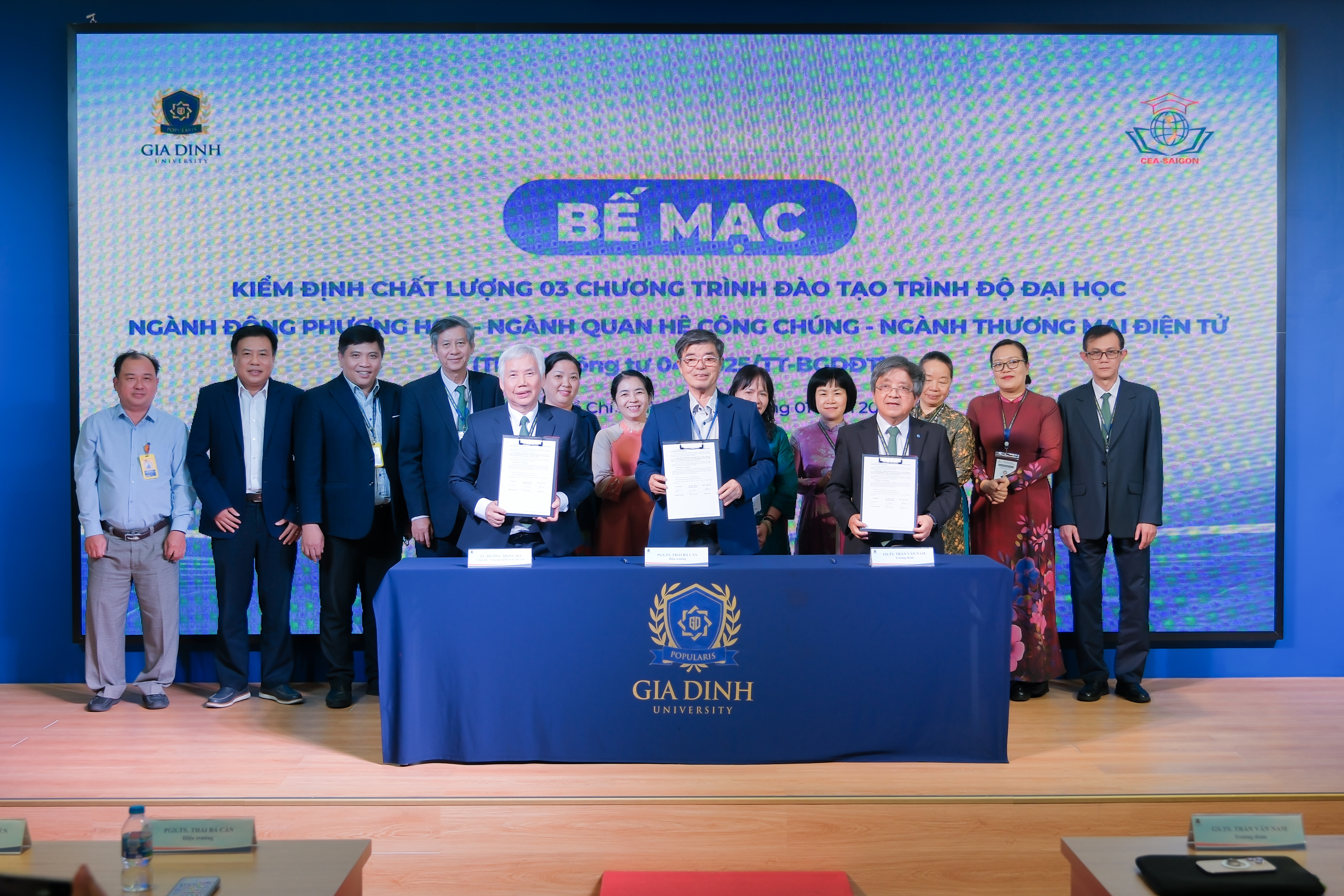 Kết thúc chương trình làm việc, Đoàn Đánh giá ngoài Trung tâm Kiểm định chất lượng giáo dục Sài Gòn và đại diện GDU đã tiến hành ký kết biên bản hoàn thành đợt khảo sát chính thức đối với ba chương trình đào tạo: Thương mại điện tử, Quan hệ công chúng, Đông phương học. Biên bản là văn bản pháp lý xác nhận việc hoàn tất các nội dung khảo sát theo đúng quy trình kiểm định chất lượng giáo dục đại học.