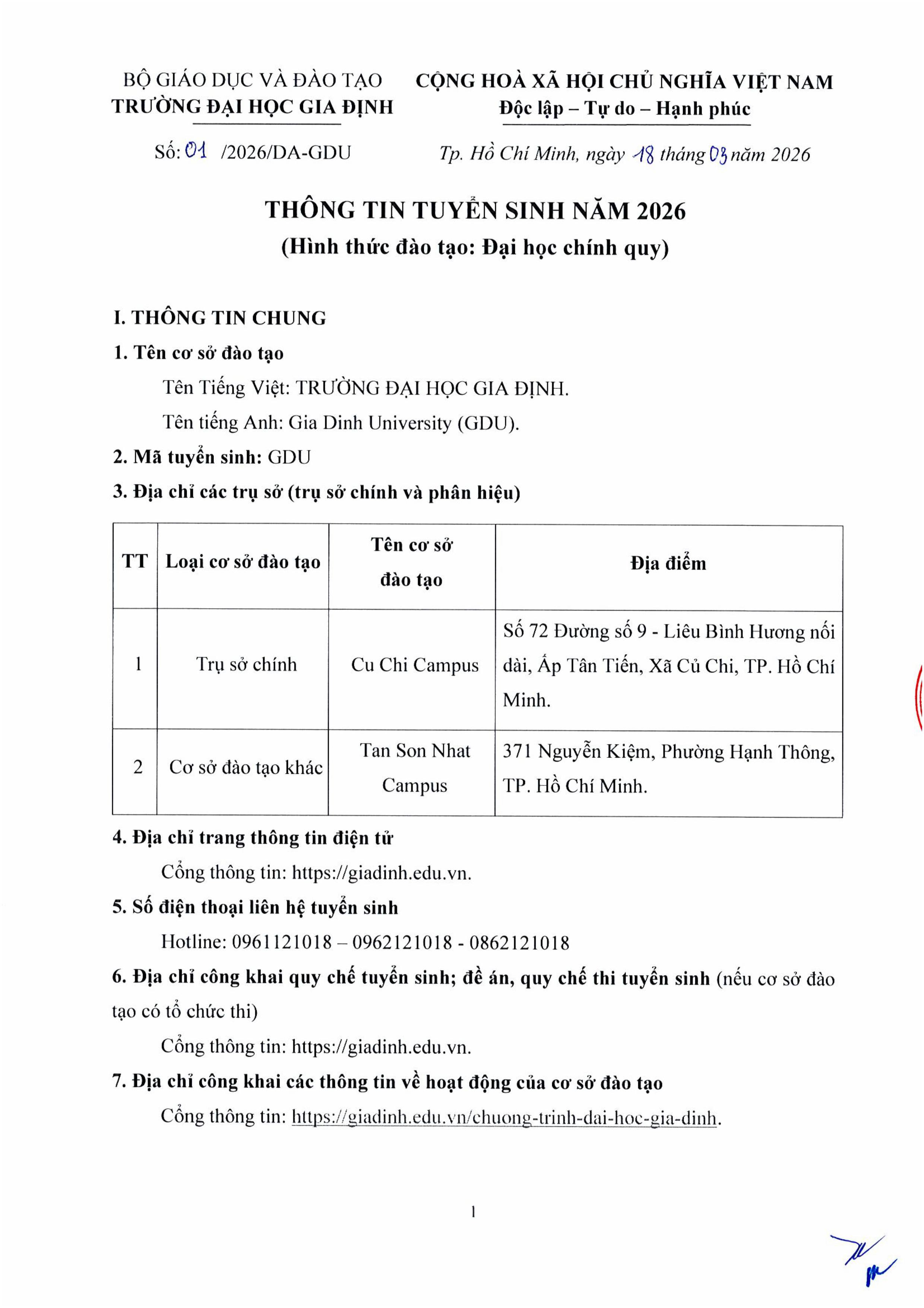 Ngày 18/03/2026, Hội đồng Tuyển sinh Trường Đại học Gia Định (GDU) đã chính thức công bố Đề án tuyển sinh năm 2026.