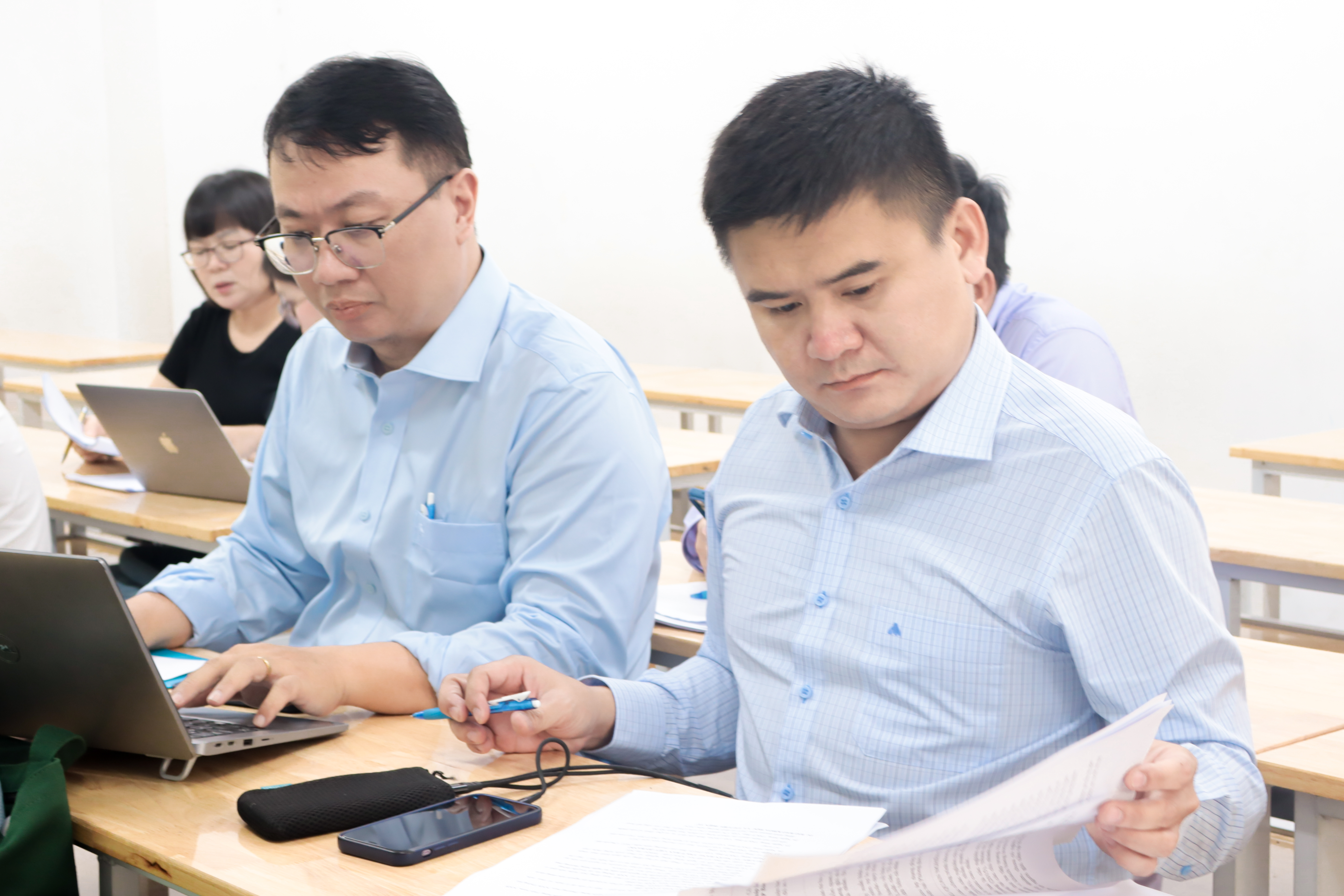 Các học viên tập trung nghiên cứu tài liệu và theo dõi phần trình bày tại buổi bảo vệ đề cương.