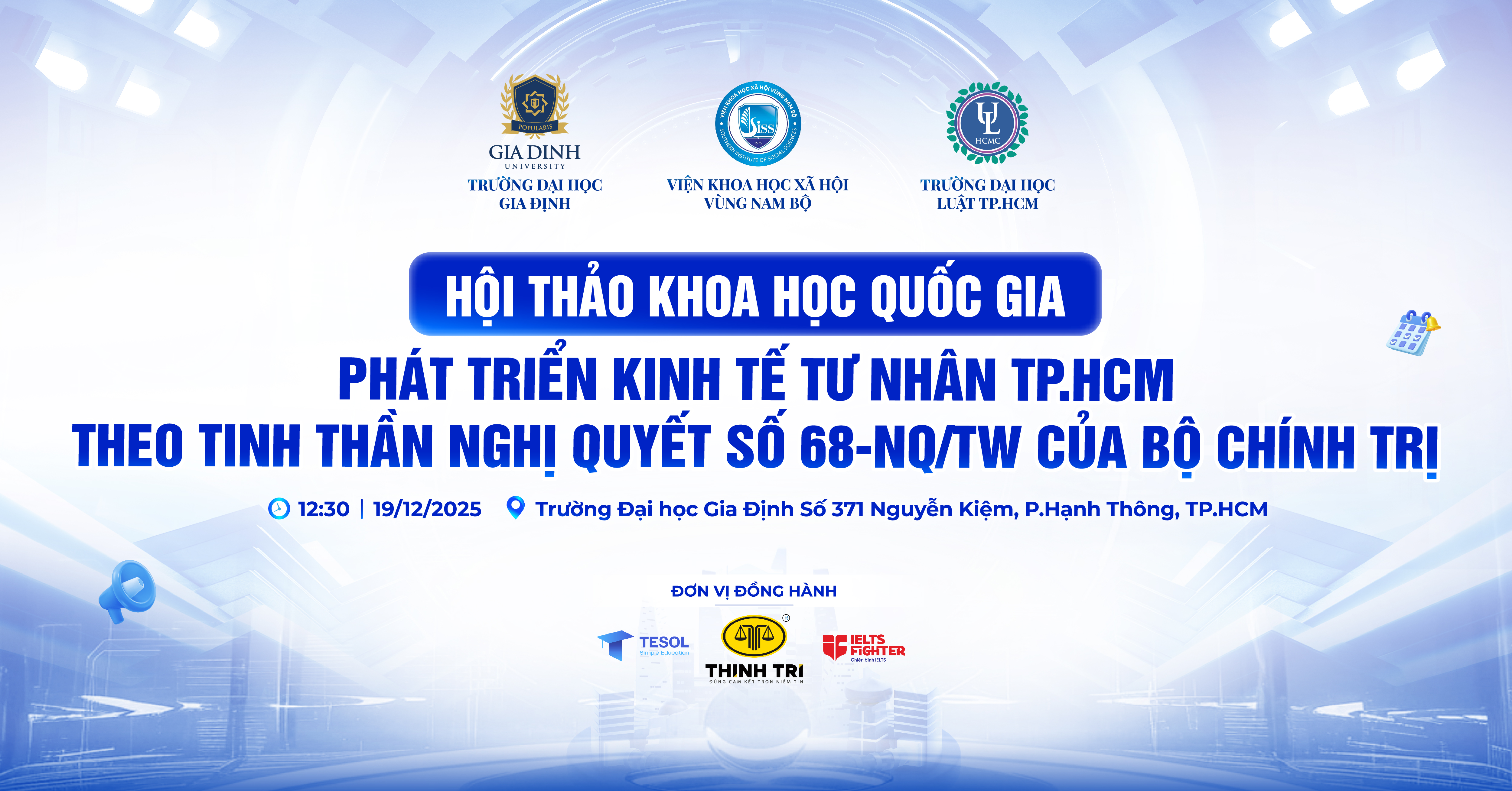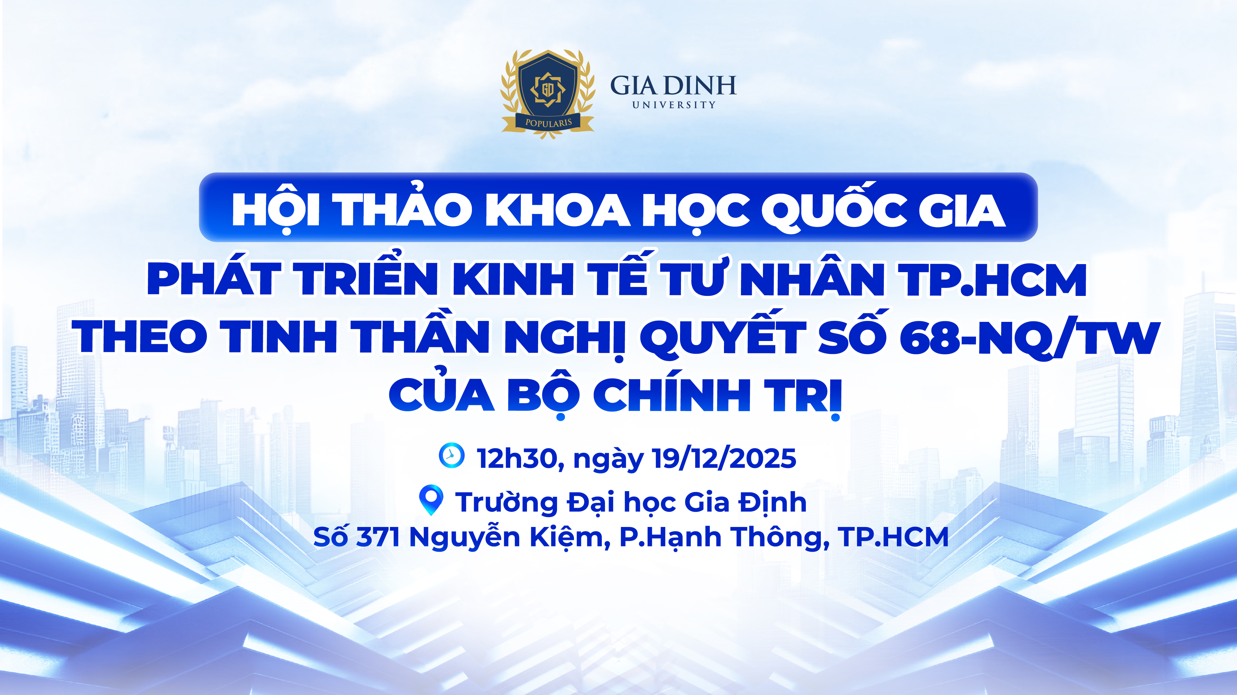 Hội thảo Khoa học Quốc gia "Phát triển kinh tế tư nhân trên địa bàn Thành phố Hồ Chí Minh theo tinh thần Nghị quyết số 68-NQ/TW của Bộ Chính trị" được tổ chức vào 12h30 ngày 19/12/2025 tại Trường Đại học Gia Định.