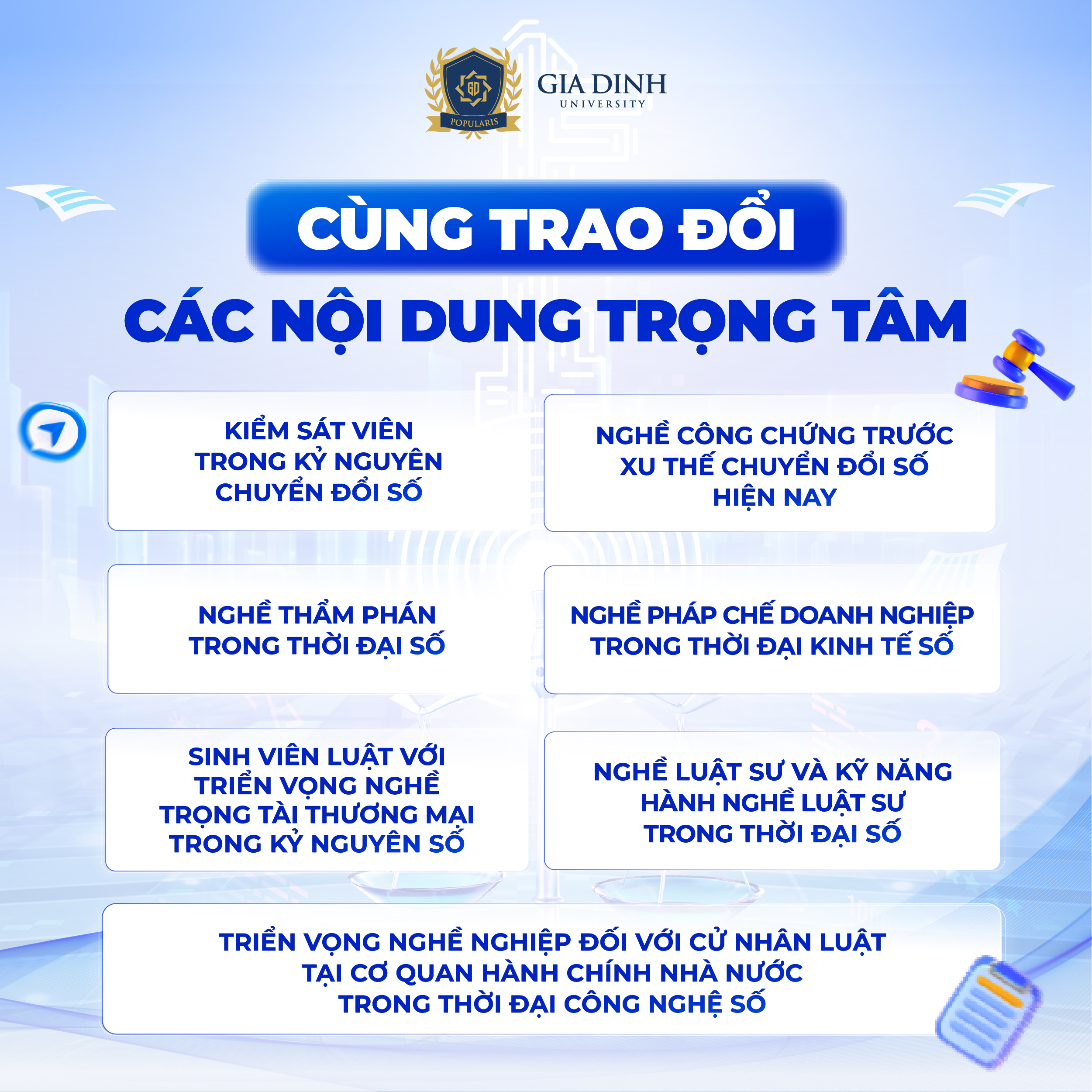 - Một hành trình mở rộng tư duy: từ nghề Kiểm sát - Thẩm phán - Pháp chế doanh nghiệp - Công chứng đến những mảng nghề mới trong kỷ nguyên số.