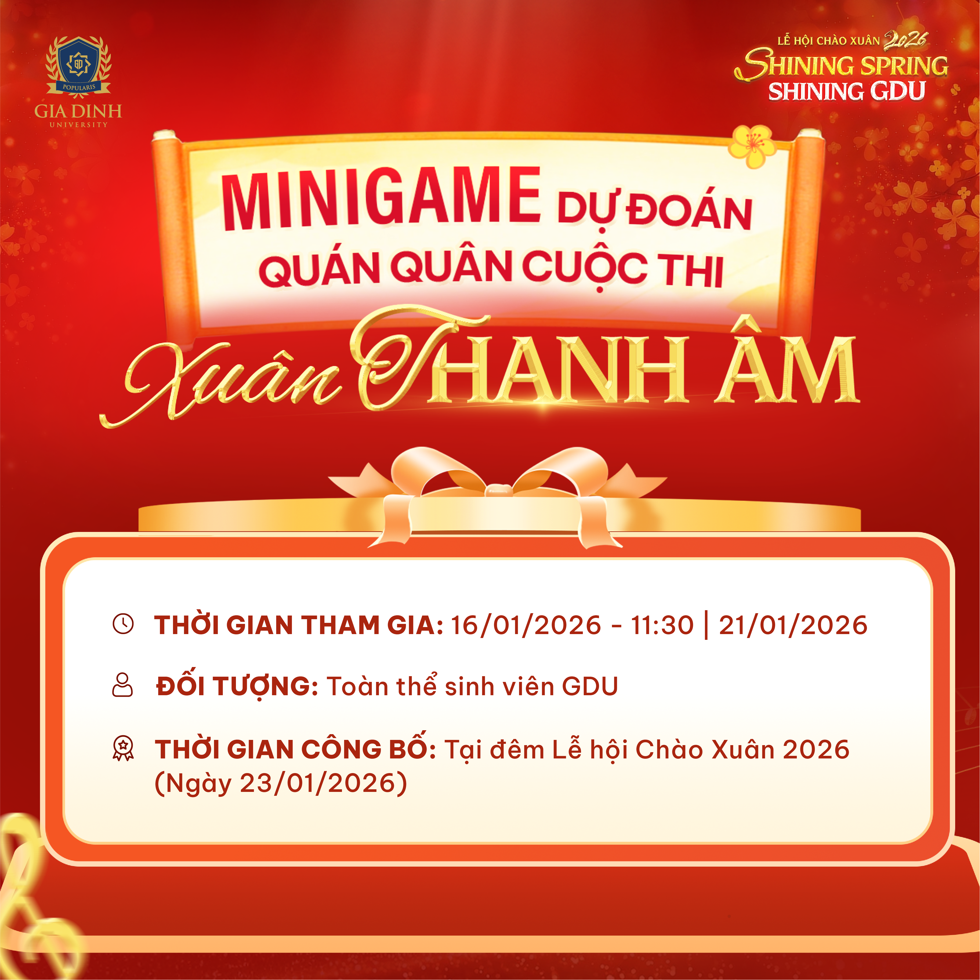 Để tăng thêm sức nóng cho đường đua đến ngôi vị cao nhất, BTC chính thức phát động Minigame tương tác dành cho toàn thể sinh viên GDU. Chương trình diễn ra từ ngày 16/01 đến 11h30 ngày 21/01/2026.