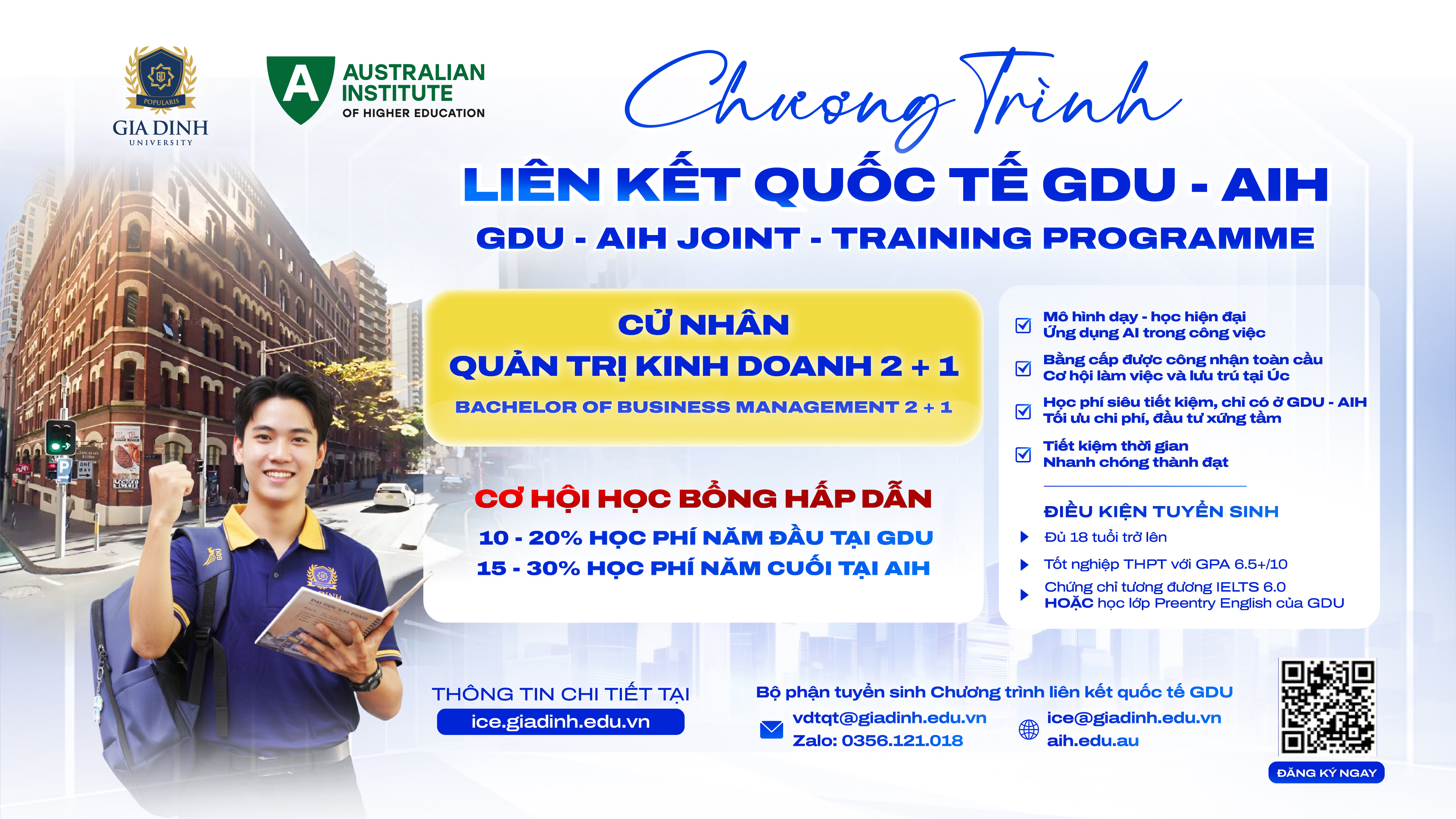 Lượt xem: 26Trong thời đại hội nhập, giấc mơ du học và làm việc tại thị trường quốc tế không còn là điều xa vời. Với sinh viên Trường Đại học Gia Định (GDU), cơ hội ấy đang trở nên gần hơn bao giờ hết khi nhà trường triển khai Chương trình Liên kết quốc tế GDU - AIH (Úc), ngành Cử nhân Quản trị Kinh doanh 2+1, mở ra hành trình học tập - trải nghiệm - vươn tầm toàn cầu cho sinh viên.