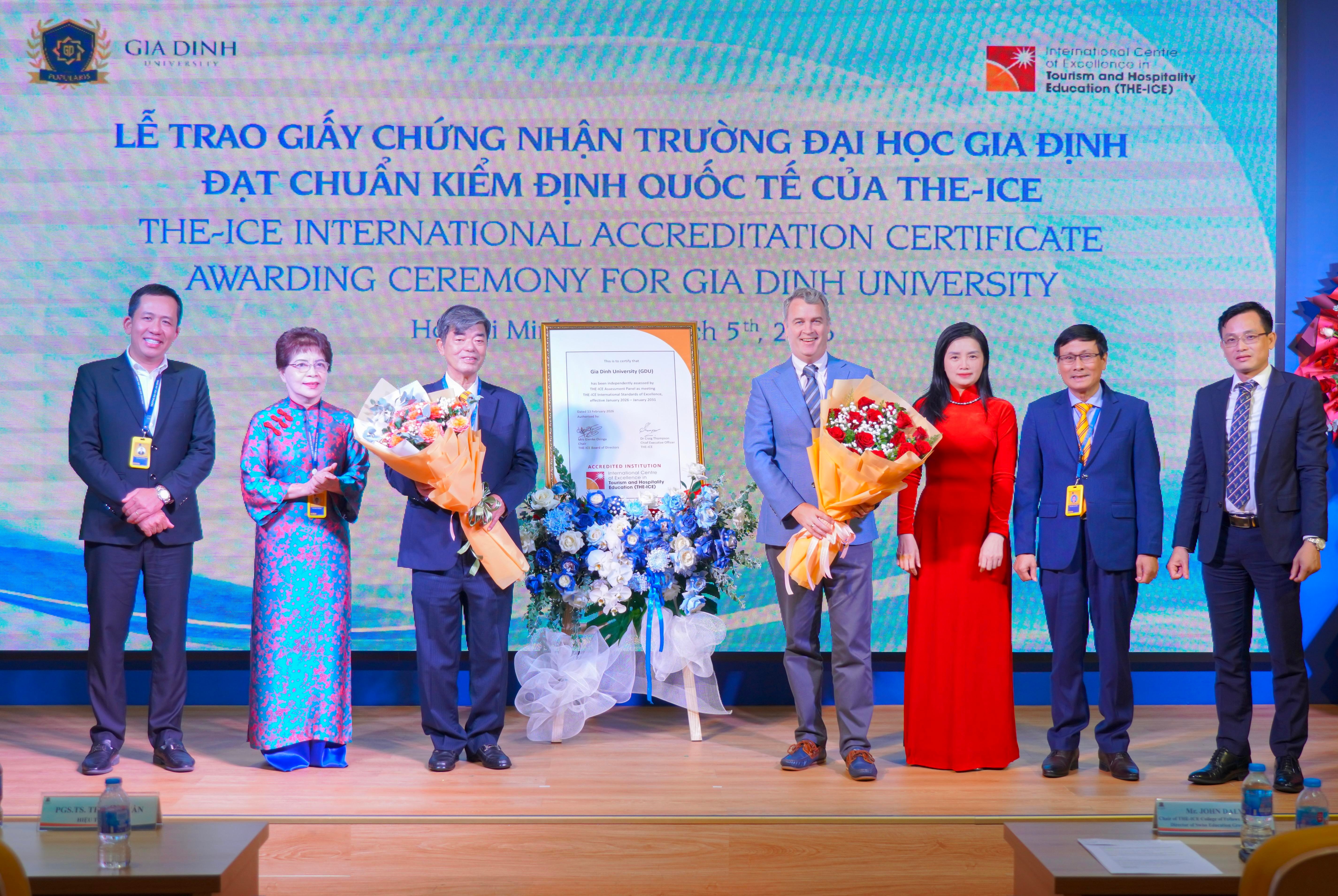 Thạc sĩ Trịnh Hữu Chung, Phó hiệu trưởng Trường ĐH Gia Định, cho biết sau khi trải qua quy trình thẩm định chuyên sâu và nghiêm ngặt theo bộ tiêu chuẩn của tổ chức kiểm định giáo dục quốc tế THE-ICE (The International Centre of Excellence in Tourism and Hospitality Education, Úc), chiều nay (5.3) tổ chức này đã trao chứng nhận cho trường.
