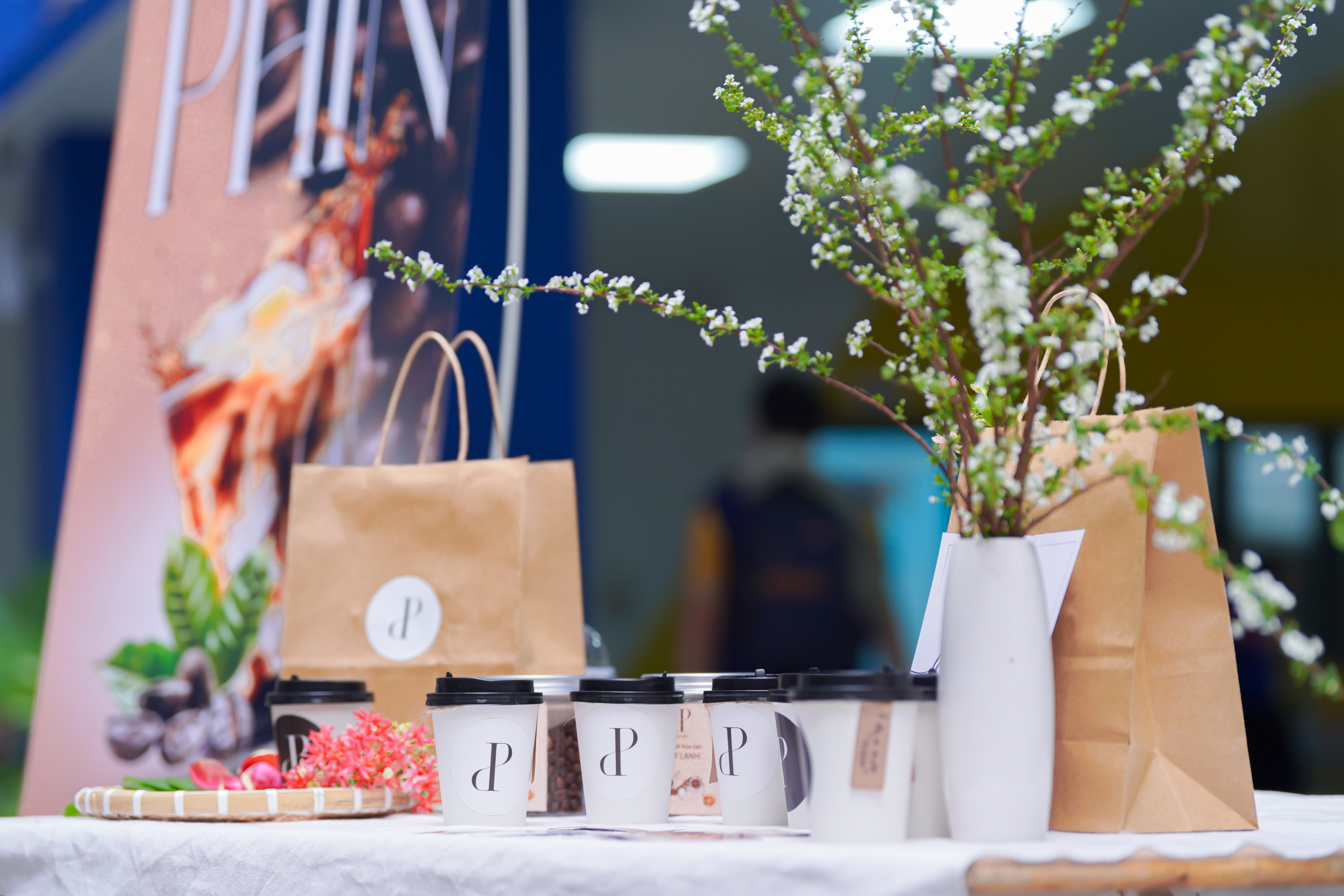 Sinh viên GDU mang đến những bộ nhận diện thương hiệu hoàn chỉnh, từ logo đến bao bì, được trưng bày ấn tượng tại góc triển lãm.