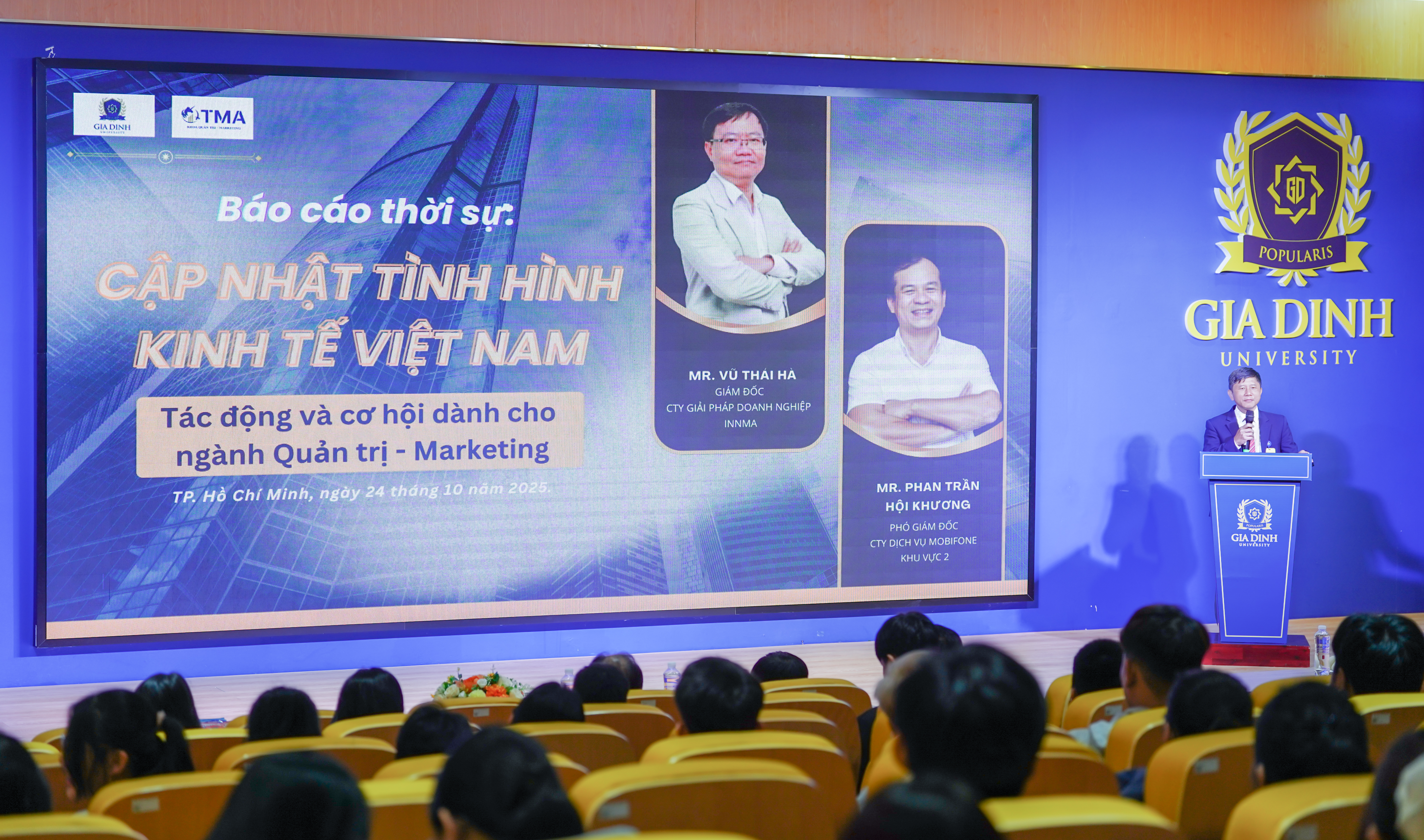 Nhằm giúp sinh viên có thêm góc nhìn thực tế, sáng ngày 24/10/2025, Khoa Quản trị - Marketing, Trường Đại học Gia Định (GDU) đã tổ chức thành công Hội thảo chuyên đề “Báo cáo thời sự: Cập nhật tình hình phát triển kinh tế Việt Nam - Tác động và cơ hội cho ngành Quản trị - Marketing”.