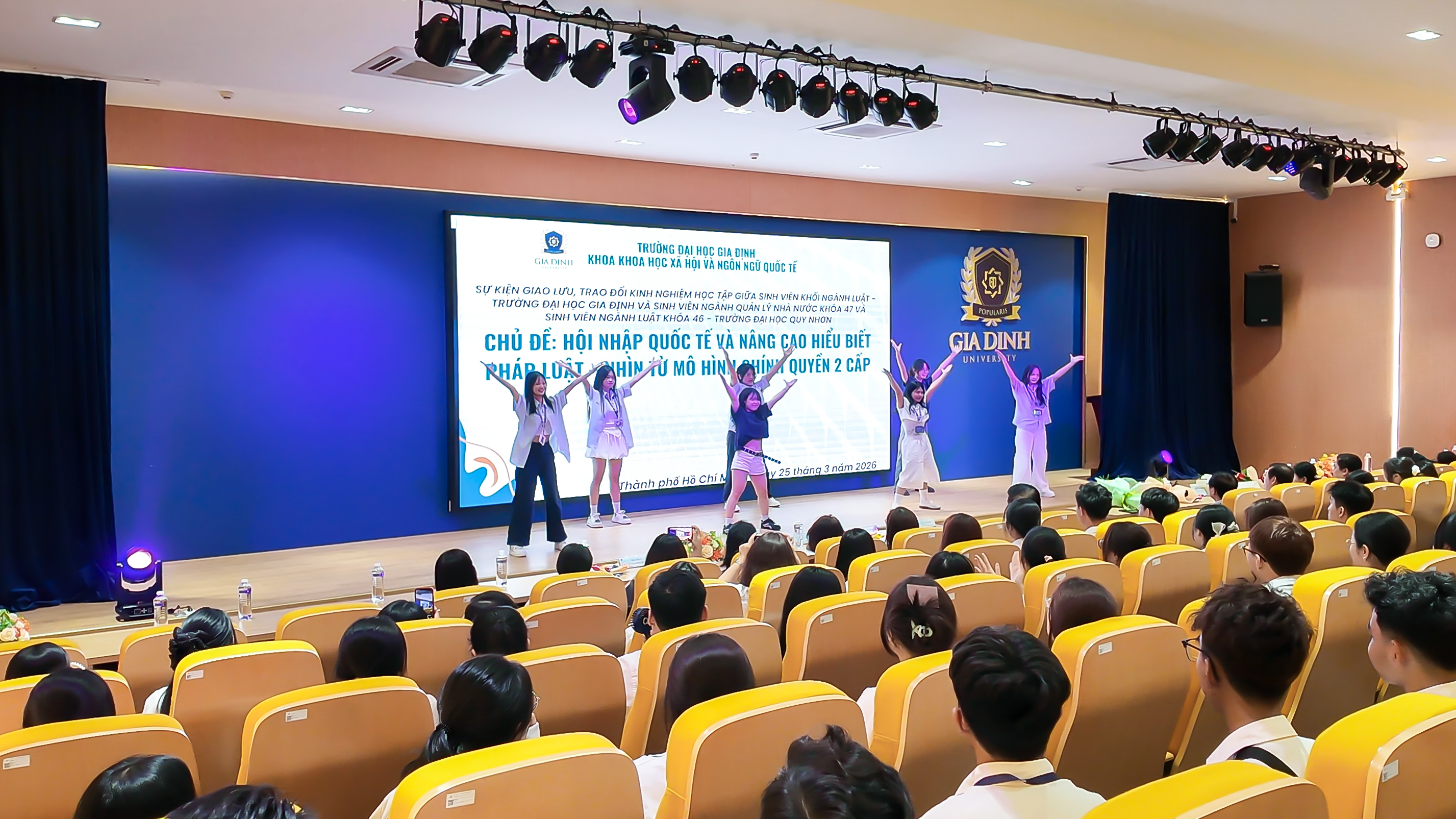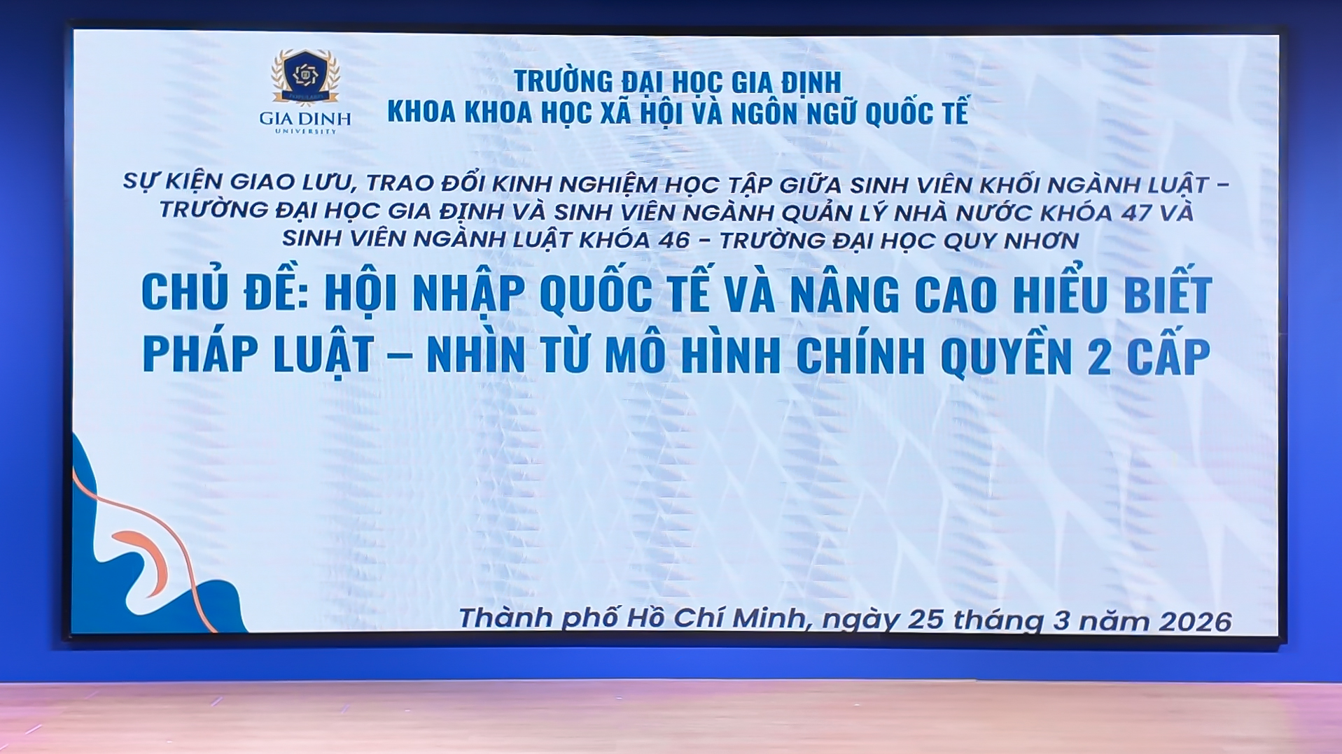 Lượt xem: 13Chiều ngày 25/3/2026, tại Hội trường B - Trường Đại học Gia Định (GDU), chương trình giao lưu, trao đổi kinh nghiệm giữa sinh viên khối ngành Luật GDU và sinh viên ngành Quản lý Nhà nước khóa 47, ngành Luật khóa 46 đến từ Trường Đại học Quy Nhơn đã diễn ra trong không khí sôi nổi, cởi mở và giàu giá trị học thuật.