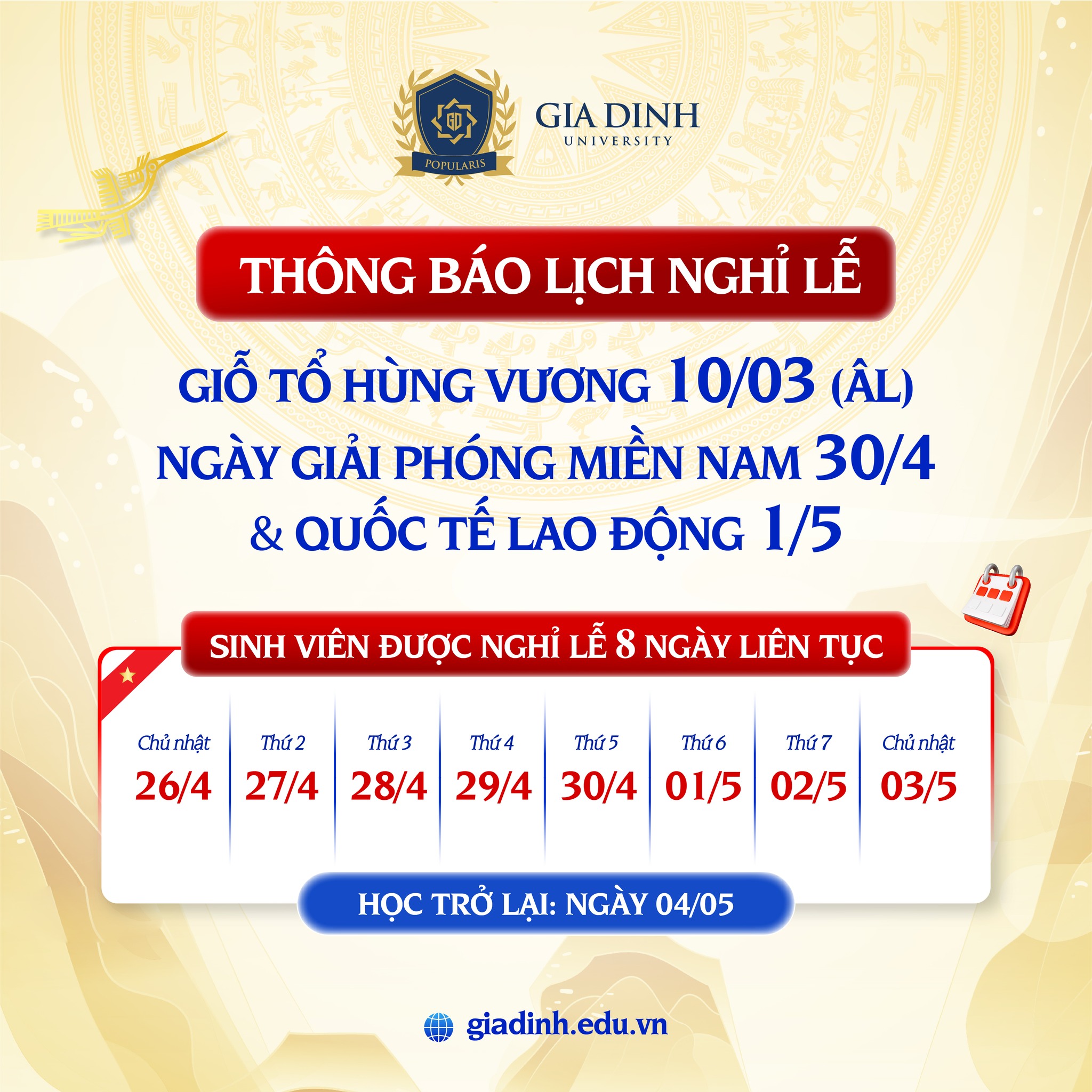 Lượt xem: 9Nhân dịp các ngày lễ lớn của đất nước gồm Giỗ Tổ Hùng Vương (10/3 Âm lịch), Ngày Giải phóng miền Nam 30/4 và Quốc tế Lao động 1/5, Trường Đại học Gia Định (GDU) thông báo lịch nghỉ lễ dành cho sinh viên như sau: