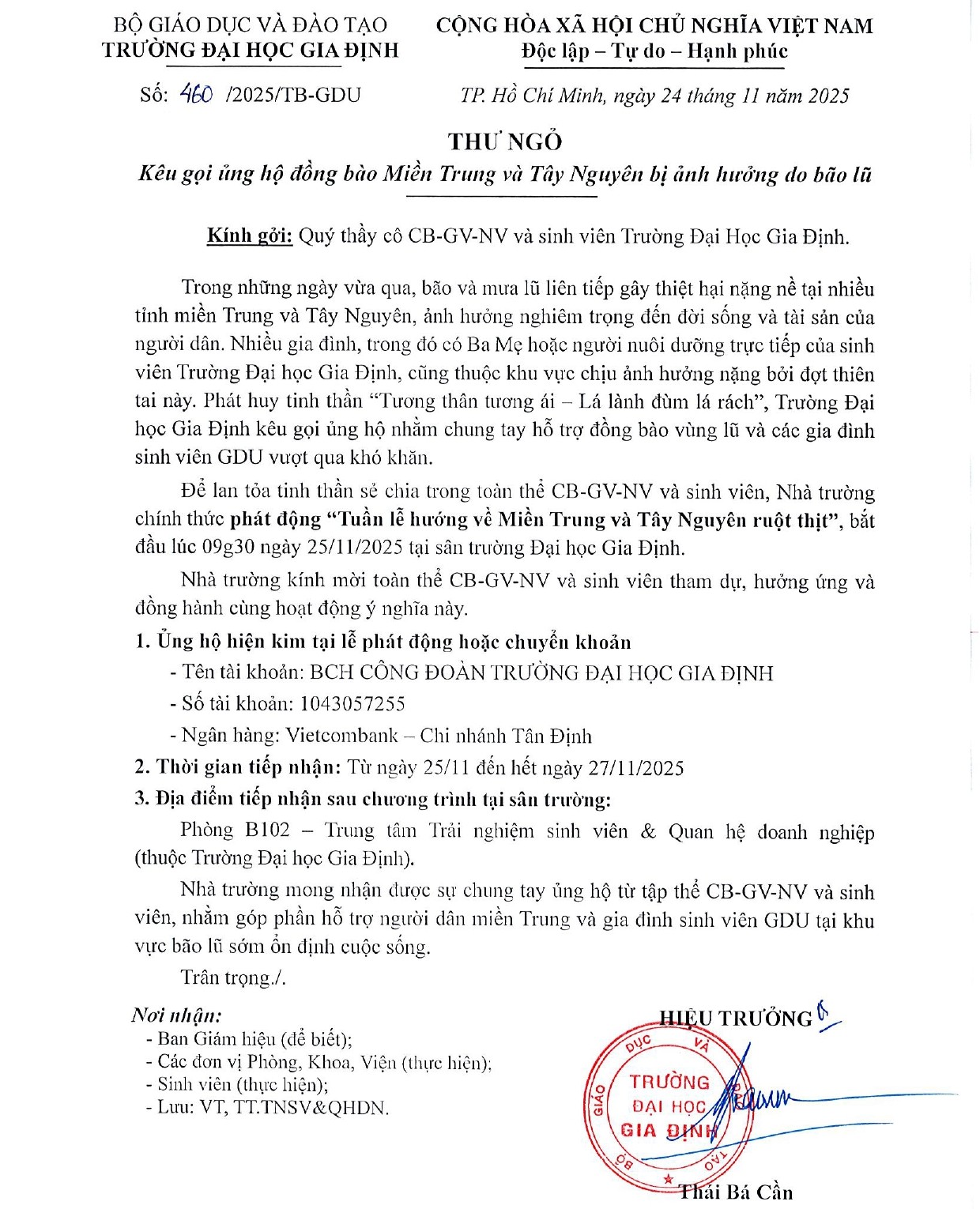 Trường Đại học Gia Định kêu gọi sự chung tay, ủng hộ của toàn thể giảng viên, cán bộ, nhân viên, sinh viên và cộng đồng để cùng nhau hỗ trợ đồng bào miền Trung - Tây Nguyên bị ảnh hưởng bởi thiên tai.