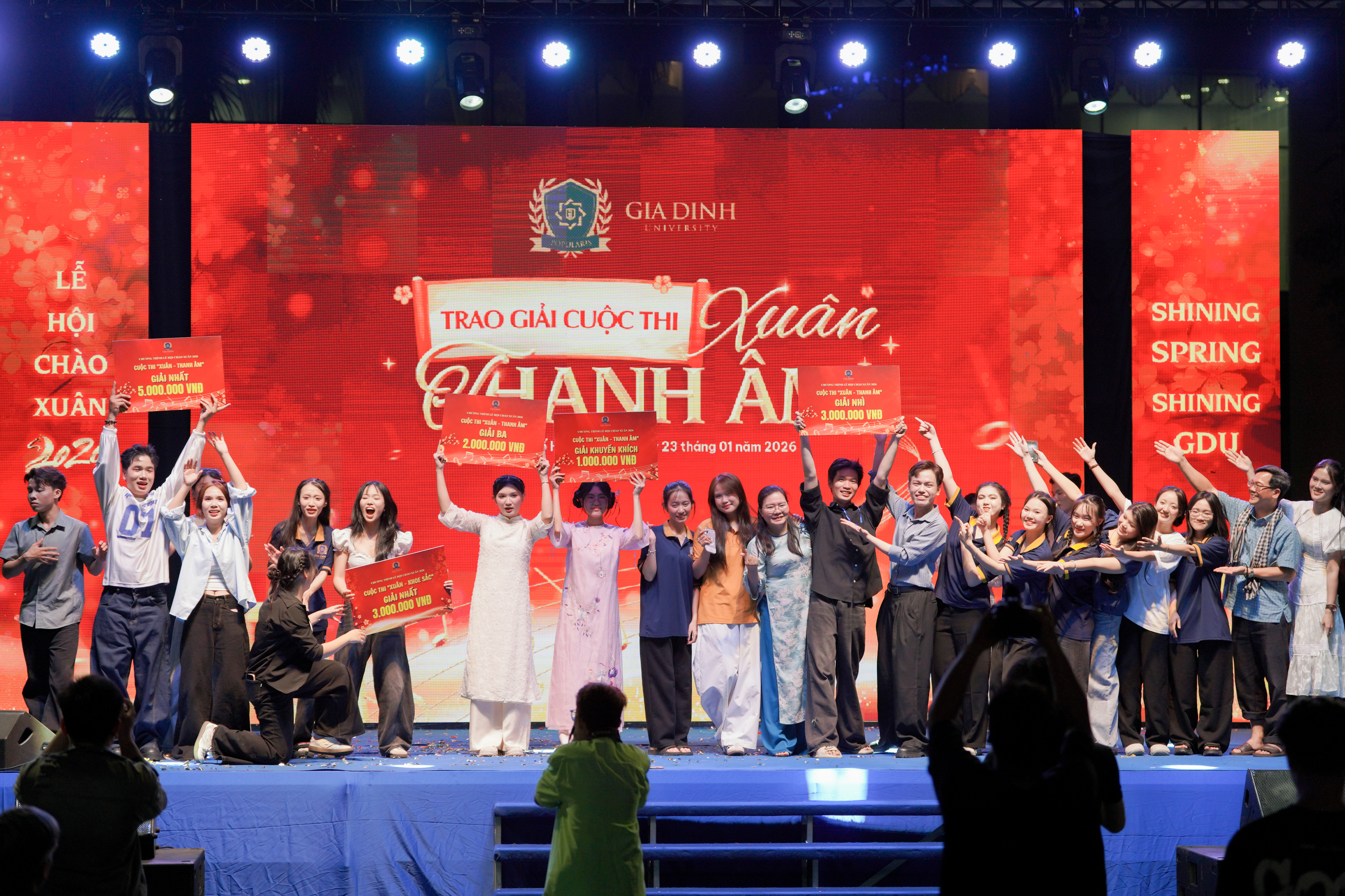 Lễ trao giải cuộc thi “Xuân - Khoe Sắc” và “Xuân - Thanh Âm” đã khép lại hai hoạt động sôi nổi của Lễ hội Chào Xuân 2026. Tuy nhiên, những giá trị mà chương trình mang lại vẫn tiếp tục lan tỏa mạnh mẽ trong cộng đồng sinh viên GDU: đó là tinh thần sáng tạo, sự tự tin thể hiện bản thân, niềm tự hào khi được học tập, rèn luyện dưới mái trường Gia Định.